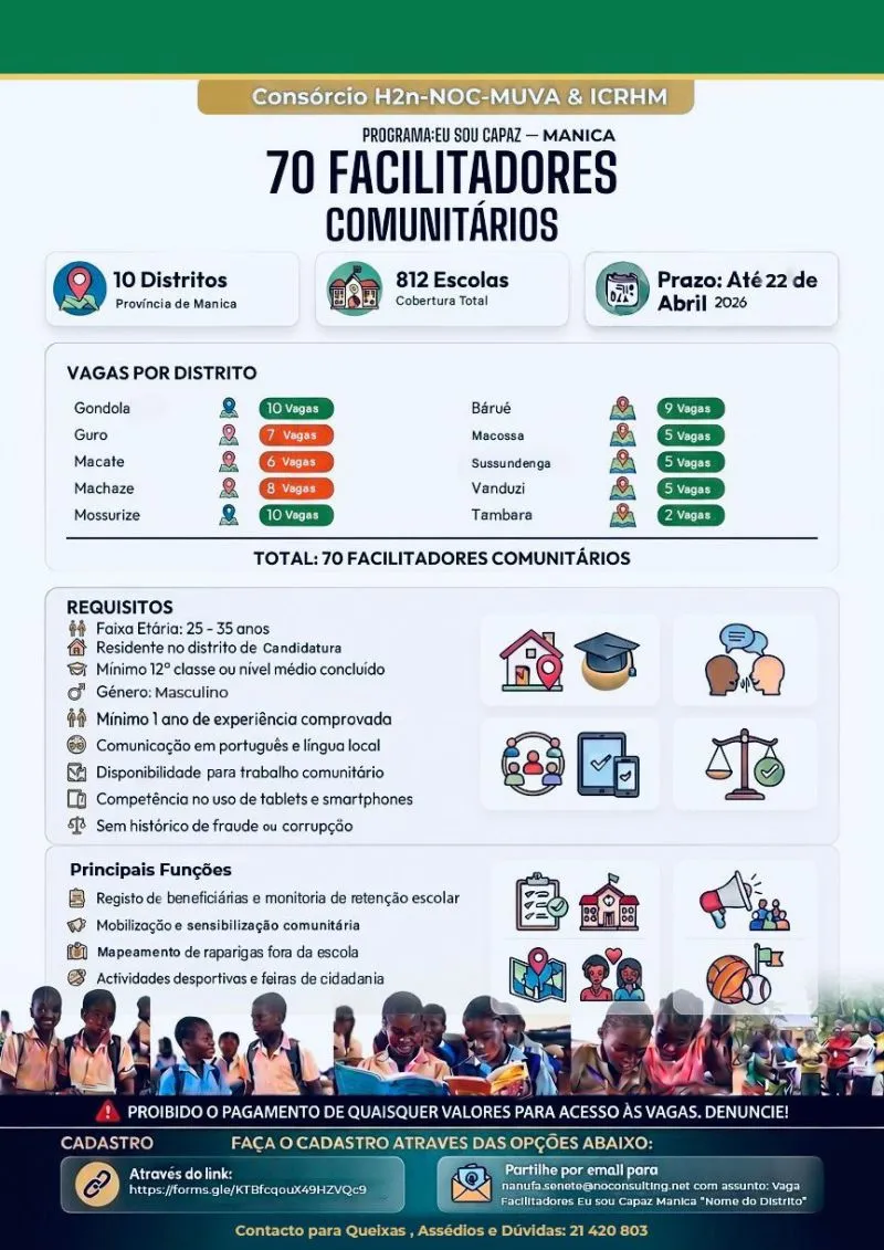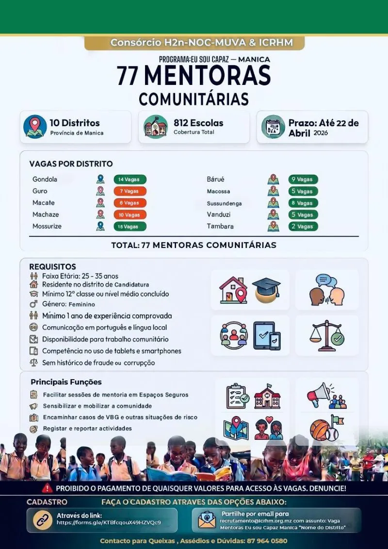 (147) Vagas de Emprego: (70) Facilitadores Comunitários e (77) Mentoras Comunitárias – Candidate-se Já Receba Novas Vagas Todos os Dias no Telegram Tempo Inteiro Manica Publicado há 2 horas H2N PARTILHAR COM AMIGOS: Siga Nossa Pagina de Facebook Clicando [Aqui] WhatsApp WhatsApp