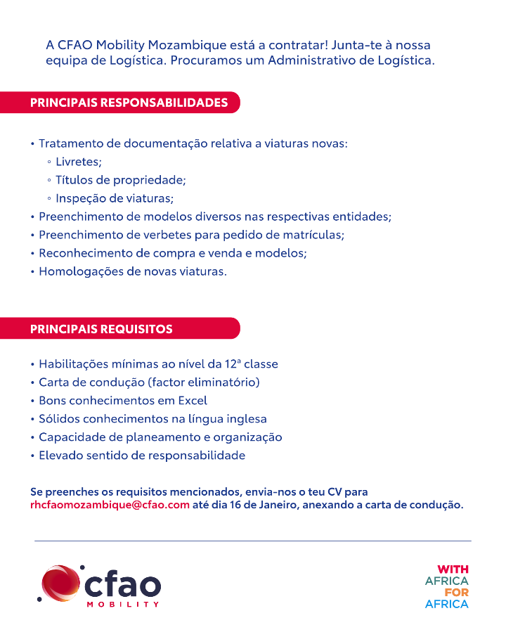 Para se candidatar a este emprego envie seu CV por e-mail para rhcfaomozambique@cfao.com