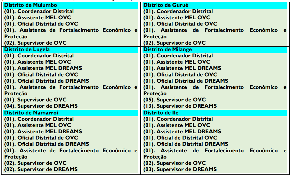 AMME (Associação Moçambicana Mulher e Educação) é uma Organização da Sociedade Civil que trabalha na província da Zambézia desde 1997, com sede em Quelimane, com a missão de contribuir para o bem-estar social, político e económico e satisfação dos direitos das comunidades usando abordagens integradas baseada em direitos humanos, de género e de estratégias de comunicação para a mudança social e de comportamento. No âmbito da implementação do projeto Fortifying OVC Services, Empowering Adolescents and Youth, and Leveraging Community Response (FELIZ), consórcio liderado pela Kukumbi, financiado pela USAID, com duração de cinco anos, focalizado na melhoria da saúde, da resiliência econômica e o bem-estar de Órfãos e Crianças Vulneráveis (OVC), adolescentes e jovens, fortalecendo os mecanismos de resposta da Comunidade, na Zambézia, para os distritos de MILANGE, MULUMBO, GURUÉ, LUGELA, ILE E NAMARROI. Para os devidos efeitos a AMME pretende recrutar profissionais qualificados e experientes nas seguintes posições a nível dos Distritos abaixo: