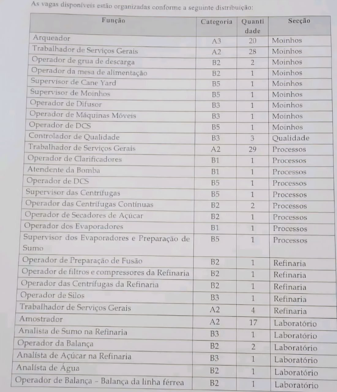 Para garantir a promoção do emprego local e a adopção de práticas de recrutamento justas, transparentes e inclusivas, obedecendo os procedimentos de recrutamento vigentes na empresa, as candidaturas devem ser entregues no sector de Capital Humano da Fábrica, sita na entrada principal da fábrica, mediante apresentação de declaração de residência passada pelo secretário do bairro carrimbada pelo Posto Administrativo de Xinavane.