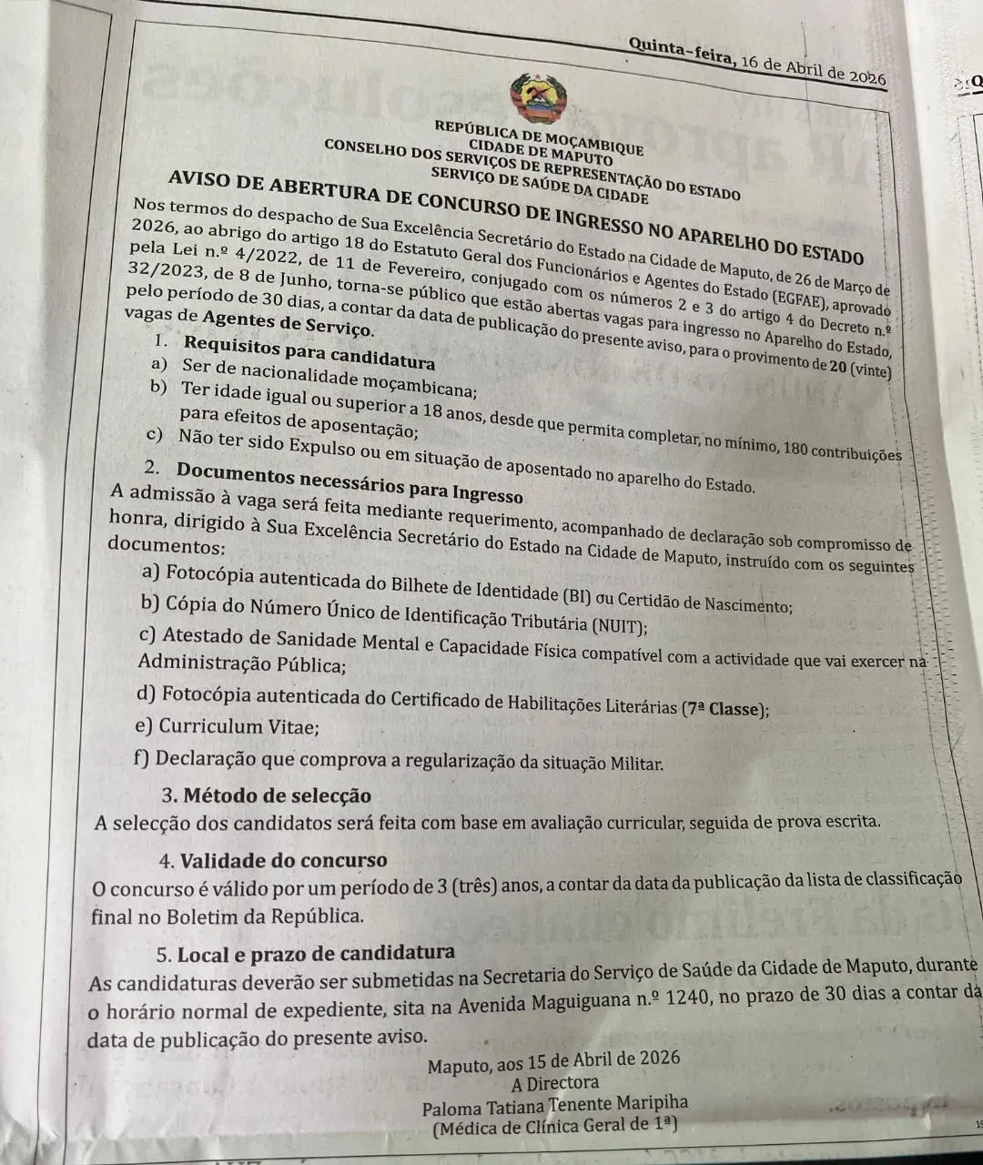 Últimas Oportunidades: (20) Vagas para Agentes de Serviços Receba Novas Vagas Todos os Dias no Telegram Tempo Inteiro Maputo Publicado há 3 horas Concurso Publico PARTILHAR COM AMIGOS: Siga Nossa Pagina de Facebook Clicando [Aqui] WhatsApp WhatsApp