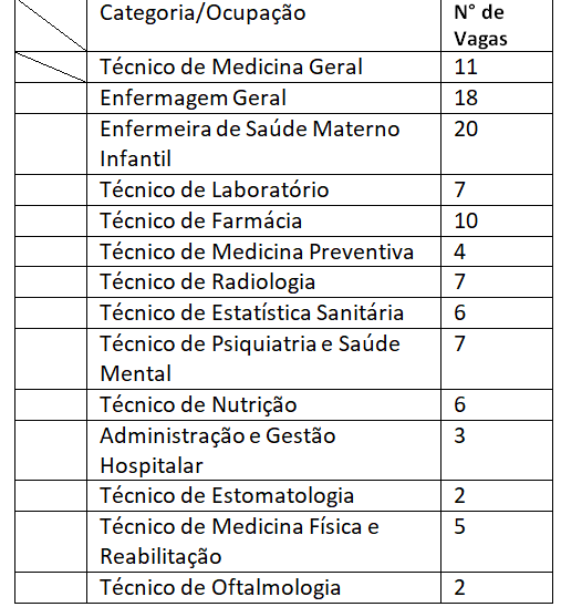 De acordo com o Despacho 30 de Maio de 2023, da Exma. Senhora Administradora do Distrito da Manhiça, ao abrigo dos números 2 e 3 do artigo 35 do Estatuto Geral dos Funcionários e Agente do Estado, aprovado pela Lei n.º 4/2022, de 11 de Fevereiro as condições excepcionais de ingresso de profissionais de saúde e das áreas de apoio com dispensa de concurso público, estão abertas para o ingresso no aparelho do estado, por um período de 30 dias, para o provimento de 153 vagas de profissionais de saúde nas carreiras de Clínica Geral de 2ª (5 vagas) Médicos de Clínica Geral de 2ª (5 vagas), Técnico de Saúde (108 vagas), Técnico Profissional (2 vagas), Agentes de Serviço (33 vagas) e Motorista (3 vagas) nas categorias abaixo descritas: